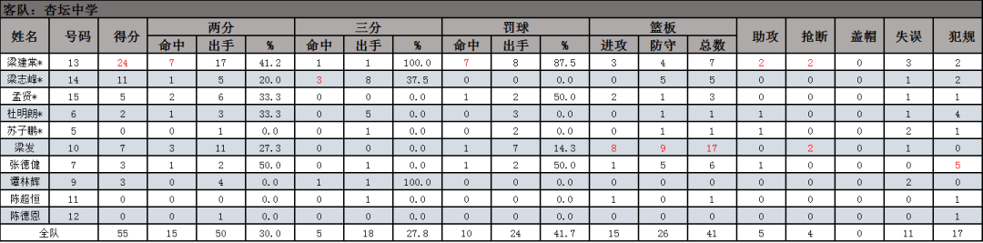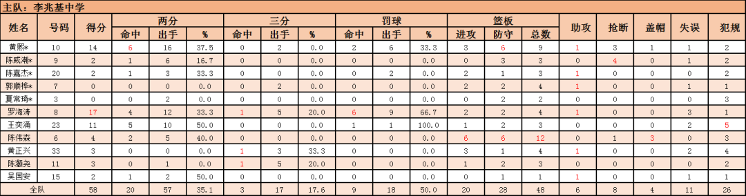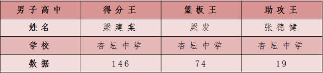 李兆基中学8号罗海涛17分4篮板,10号黄熙14分9篮板,6号陈伟森4分12篮板。杏坛中学13号梁建棠24分7篮板,14号梁志峰11分5篮板,10号梁发7分17篮板。