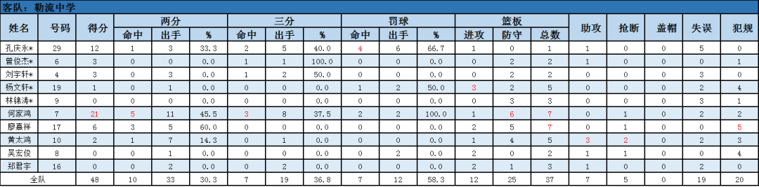 容山中学13号林炯宋14分7篮板,8号卢俊贤11分3篮板。勒流中学7号何家鸿21分7篮板,29号孔庆永12分。